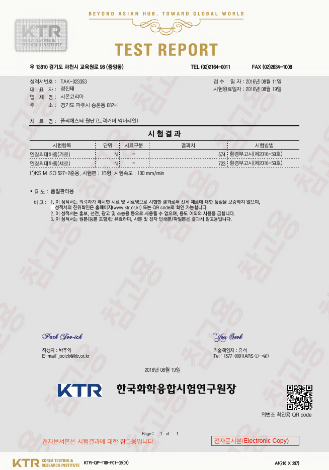당사에서 공급하는 트럭커버 멤버레인은 첨부한 테스트 결과와 같이 품질기준을 충족합